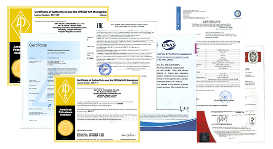ISO 9001 Quality Management System, we have various certificates, including ISO 9001, ISO 14001, ISO 45001, PED/CE, Manufacturing License of Special Equipment, CNAS, API 6D,
